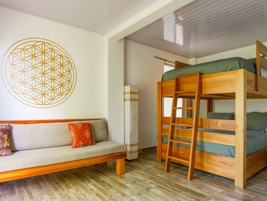 The Flower of Life is a comfortable and stylish room with a private bathroom. It contain two stacked beds with extra-thick, deluxe pillowtop mattresses, a large closet with shelves and drawers, a couch seating area and a private bathroom.